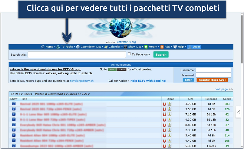 Il sito è davvero eccezionale se ti interessano principalmente i contenuti TV. Innanzitutto, offre "Pacchetti TV" completi che raggruppano insieme interi programmi o serie, per maggiore praticità. EZTV tiene traccia anche delle date di uscita e del palinsesto dei programmi, così puoi sapere quando verranno probabilmente caricati.