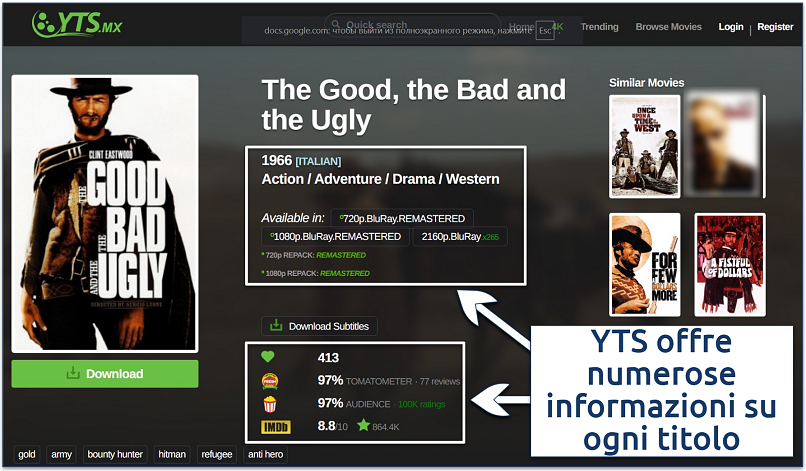 YTS è specializzato in film, quindi non troverai altri tipi di contenuti, come musica, giochi o software, che intasano i risultati delle tue ricerche. Detto questo, la piattaforma offre senza dubbio la migliore selezione di film vecchi e nuovi tra tutti i siti P2P inclusi in questo elenco. Puoi consultare anche i dati degli utenti da IMDb e RottenTomatoes, così hai l’opportunità di valutare se un film ti piacerà prima di scaricarlo.