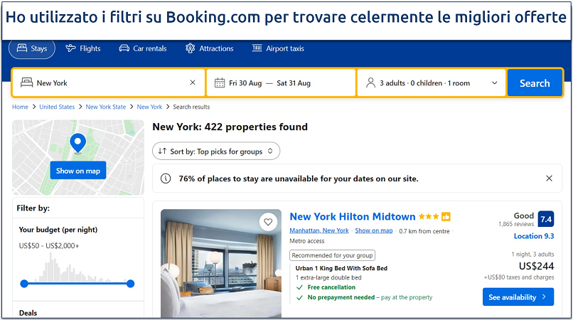 I prezzi possono variare in base all’ora del giorno e al giorno della settimana, pertanto prova a effettuare la ricerca in orari diversi. Ad esempio, quando ho cercato un hotel a 3 stelle a New York, il costo risultava pari a 1.416 dollari dal Kenya (senza VPN) e di 1.404 dollari dal Regno Unito, mentre ero connesso a un server a Londra. Tuttavia, quando mi sono connesso a un server di New York, il prezzo è sceso a 1.109 dollari.