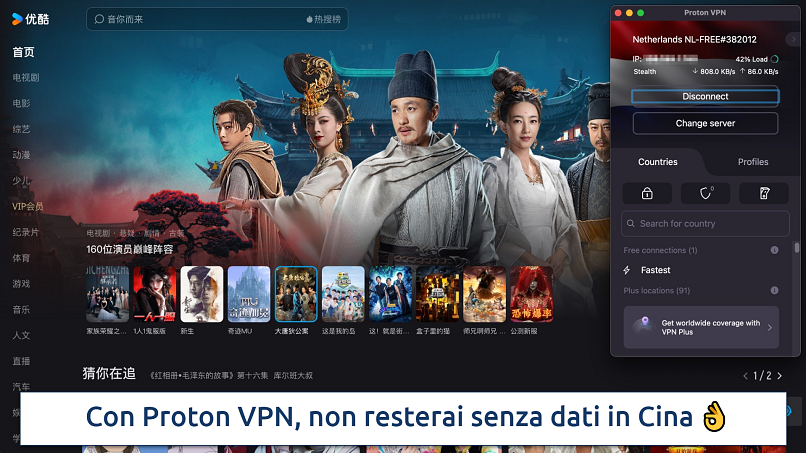 Proton VPN non prevede alcun limite al traffico di dati, per cui potrai guardare in streaming quanto vuoi su piattaforme come Youku. Alcune VPN gratuite pongono limiti anche di 500MB al mese, ma io non ho sforato alcun tetto limite utilizzando Proton VPN per fare streaming per ore sia su TikTok che su YouTube. In Cina, tuttavia, ci si può connettere solo al Giappone, perché è possibile scegliere solo la posizione più vicina.