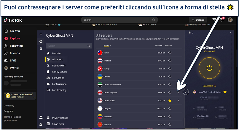 - Connettiti a un server. Scegli un server in una posizione vicina per ottenere le migliori prestazioni. Ti consentirà di mantenere una velocità di upload elevata per i tuoi video di TikTok.